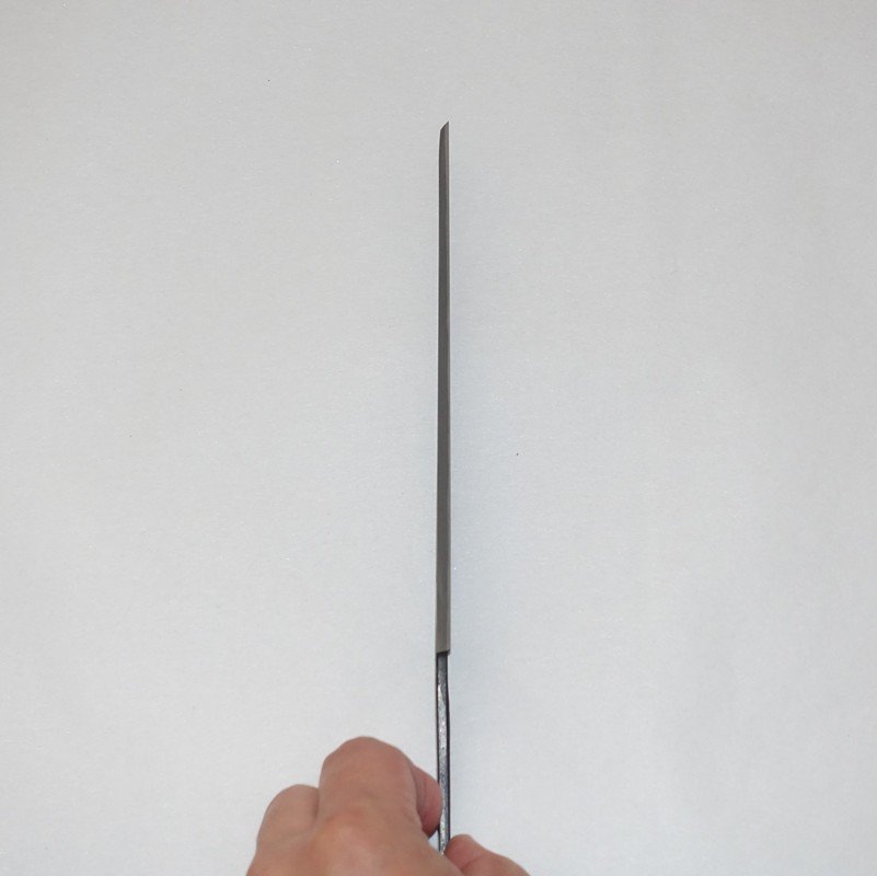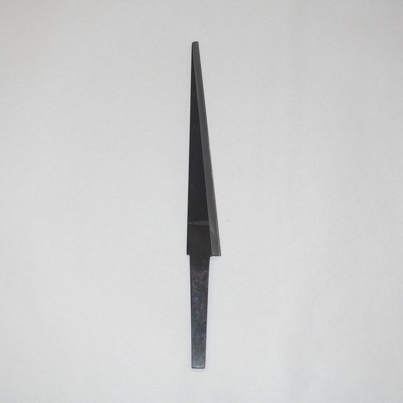 刳り小刀は鉋と異なり、直角でなく斜めに刃がついています。鉋や鑿では回転する砥石などで裏スキを行いますが、刳り小刀でも同じ方法をとると基本的に切先付近の裏スキが極浅くなってしまい、すぐにべた裏になってしまいます。刃先から根本まで同じ深さになるよう、センで裏スキを作っています。